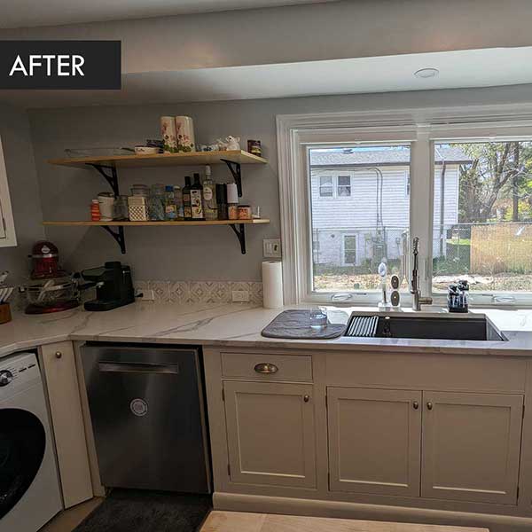 The homeowner incorporated cabinetry, tile, shelving, and a dishwasher from Community Forklift into their reconfigured kitchen.